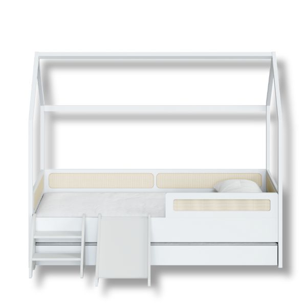 As grades de proteção vazadas são revestidas com rattan sintético, unindo charme artesanal, praticidade e segurança — o toque ideal para um quarto moderno e acolhedor.